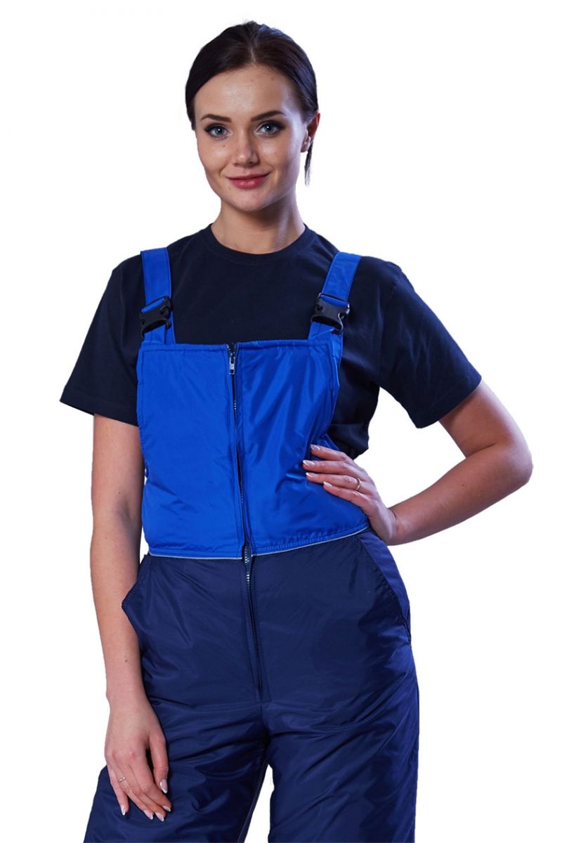 Полукомбинезон утепленный с притачными полочками спереди. Центральная застежка на тесьму «молния». Передние половинки с карманами с отрезным бочком. Спинка с притачной кокеткой, верхний край которой – фигурный. СВ кант расположен по шву притачивания кокеток.